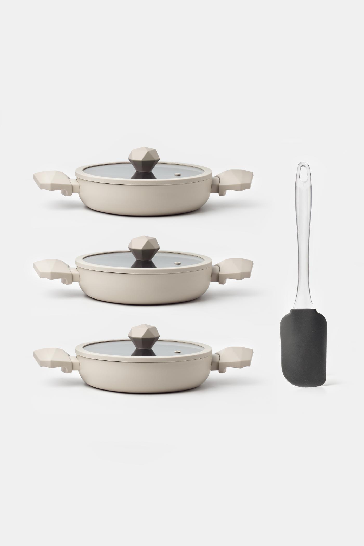 - Set İçeriği: 1 adet 18 cm sahan, 1 adet 20 cm sahan, 1 adet 22 cm sahan, 1 adet silikon spatula, 3 adet kapak