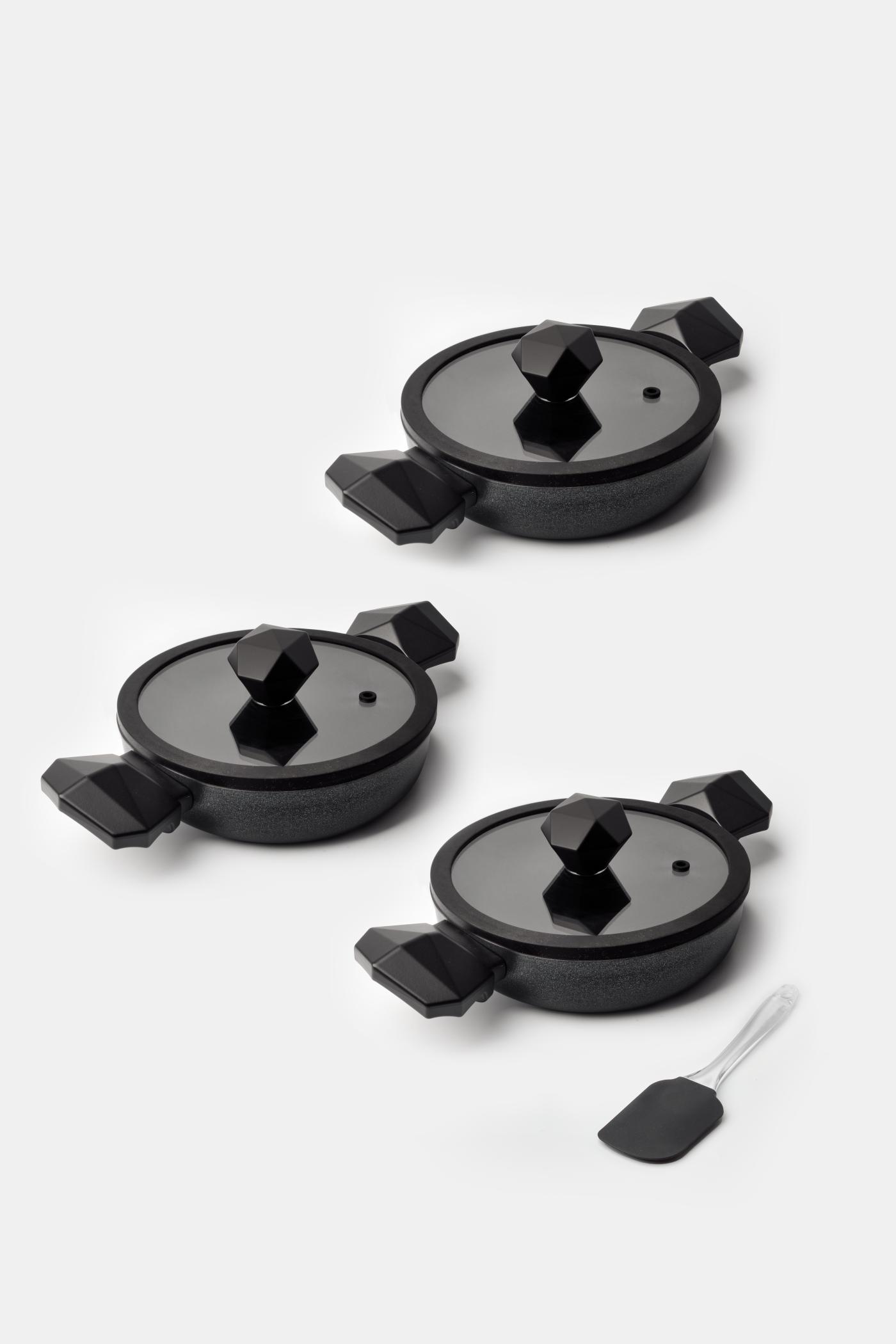 - Set İçeriği: 1 adet 18 cm sahan, 1 adet 20 cm sahan, 1 adet 22 cm sahan, 1 adet silikon spatula, 3 adet kapak